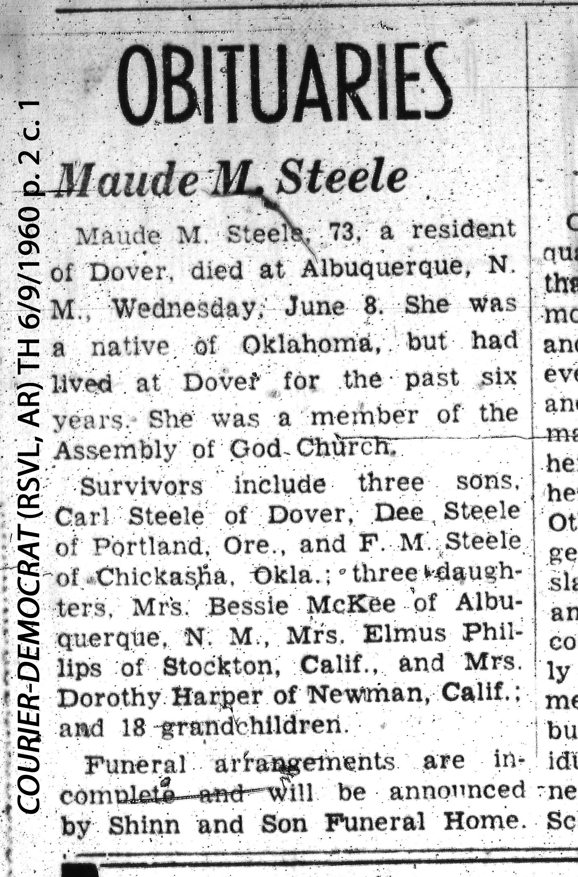 STEELE -- Mrs. Maud May Steele, 73, Dover, Ark., who came here two weeks ago to make her home, passed away here Wednesday evening after a short illness. She resided at 1837 La Veta N.E. and is survived by three daughters; three sons; 17 grandchildren; nine great grandchildren; and four sisters. She was a member of the Assembly of God Church. Funeral services will be held Saturday afternoon at 2 from Christian Missionary Alliance. The Rev. R. O. Akins will officiate. Interment will be made in Fairview Park. Strong-Thorne Mortuary is in charge of arrangements.