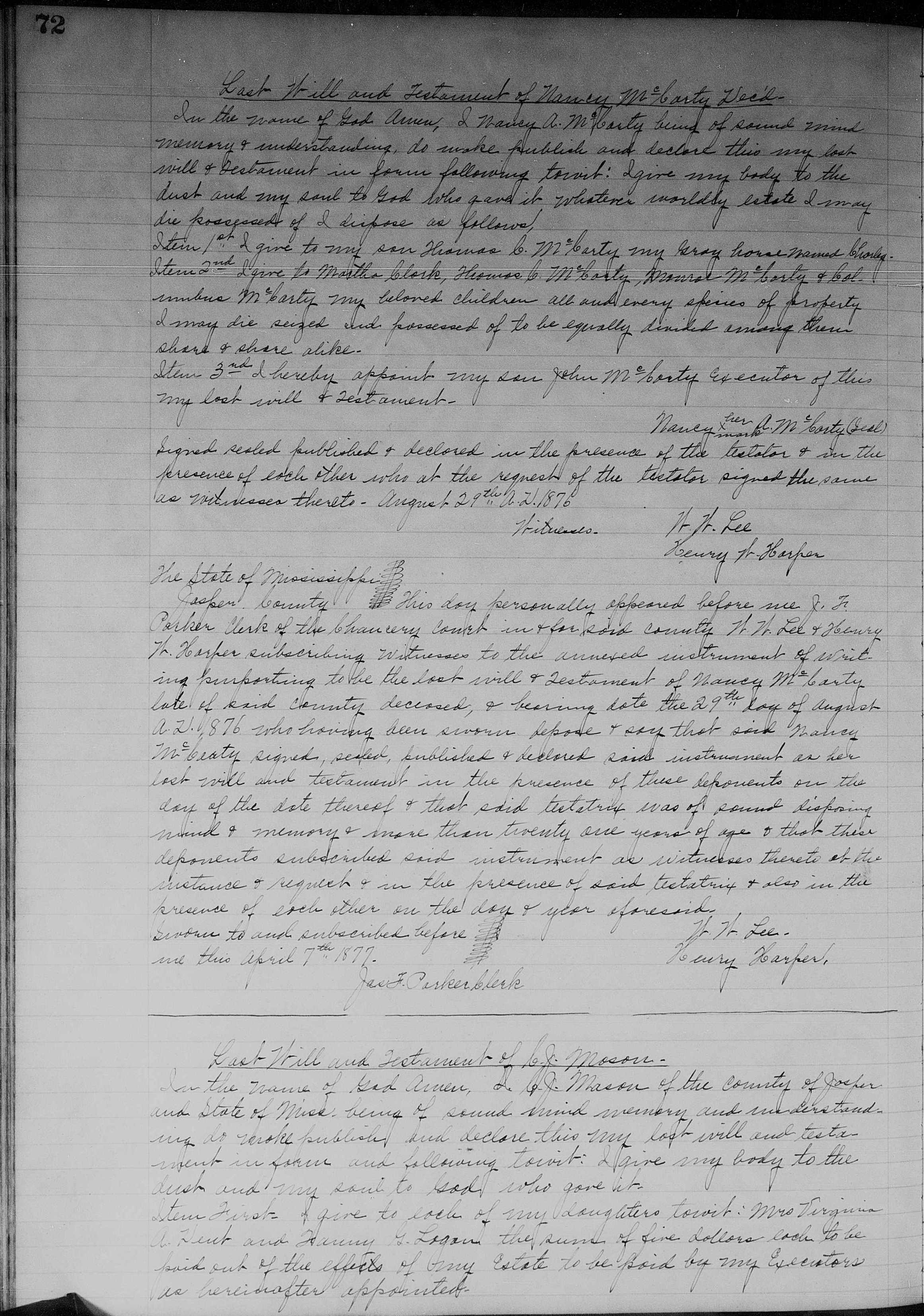 W. Harper subscribing witnesses to the annexed instrument of writing purporting to be the last will & testament of Nancy McCarty