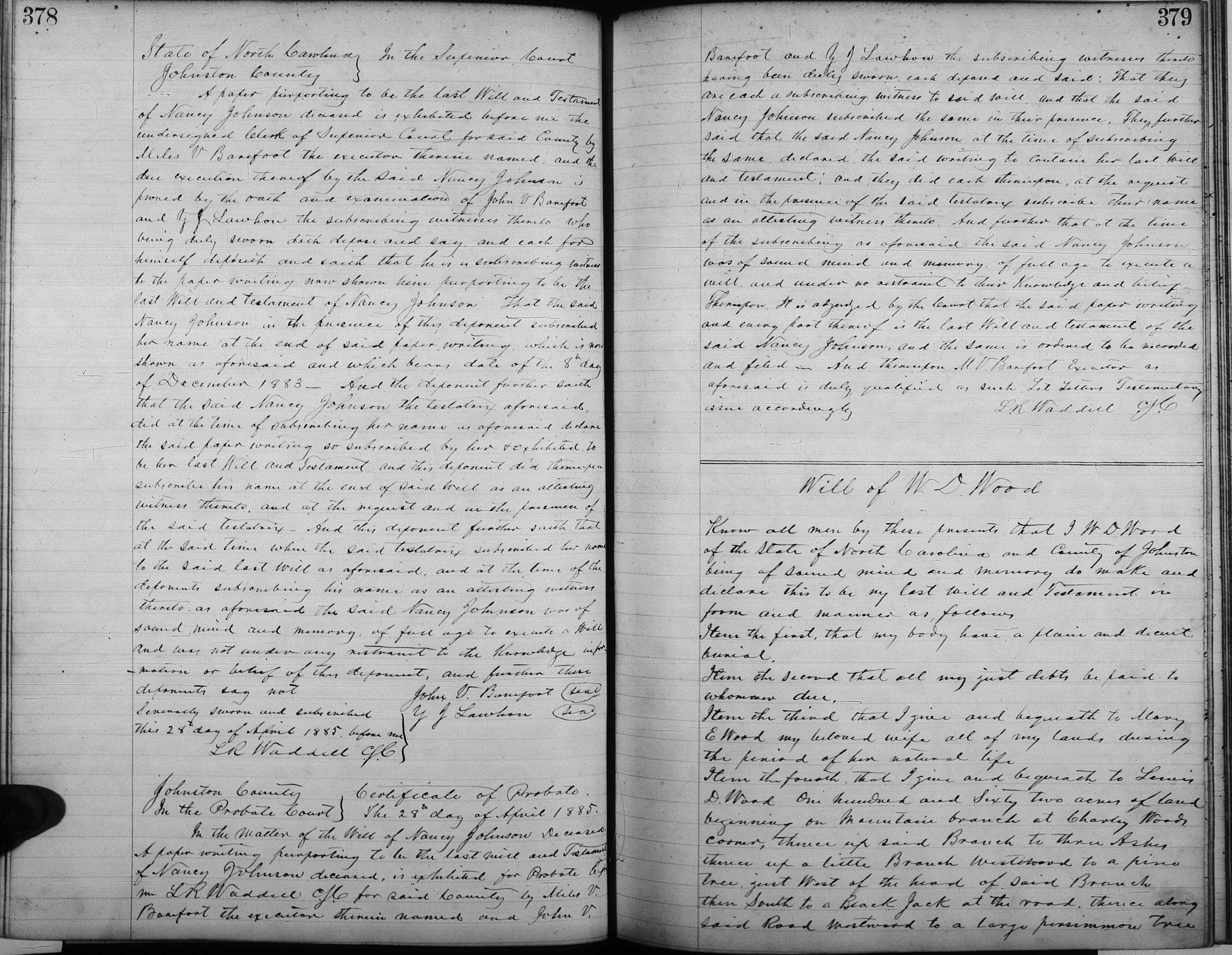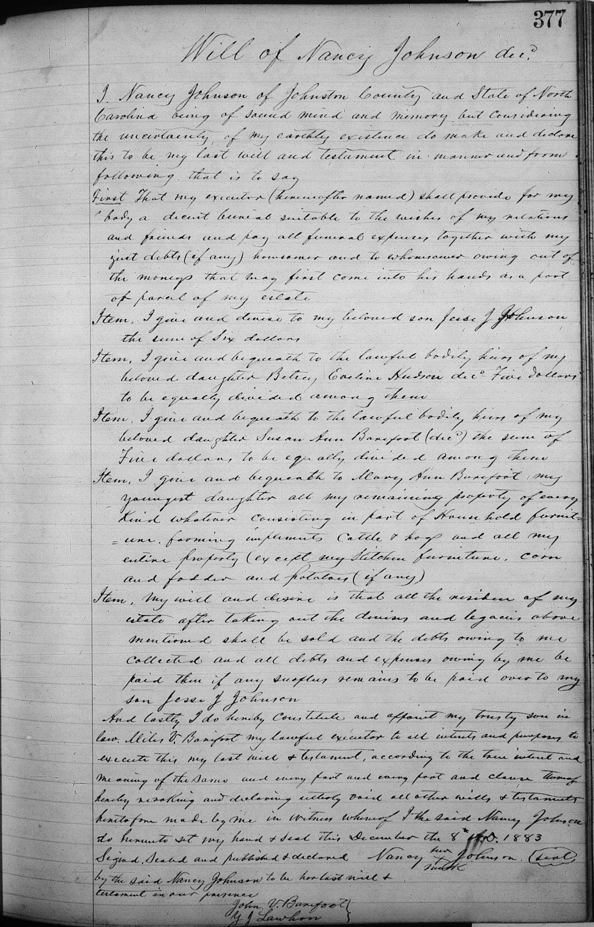 I, Nancy Johnson of Johnston County and State of North Carolina being of sound mind and memory but considering the uncertainty of my earthly existence do make and declare this to be my last will and testament in manner and form following, that is to say