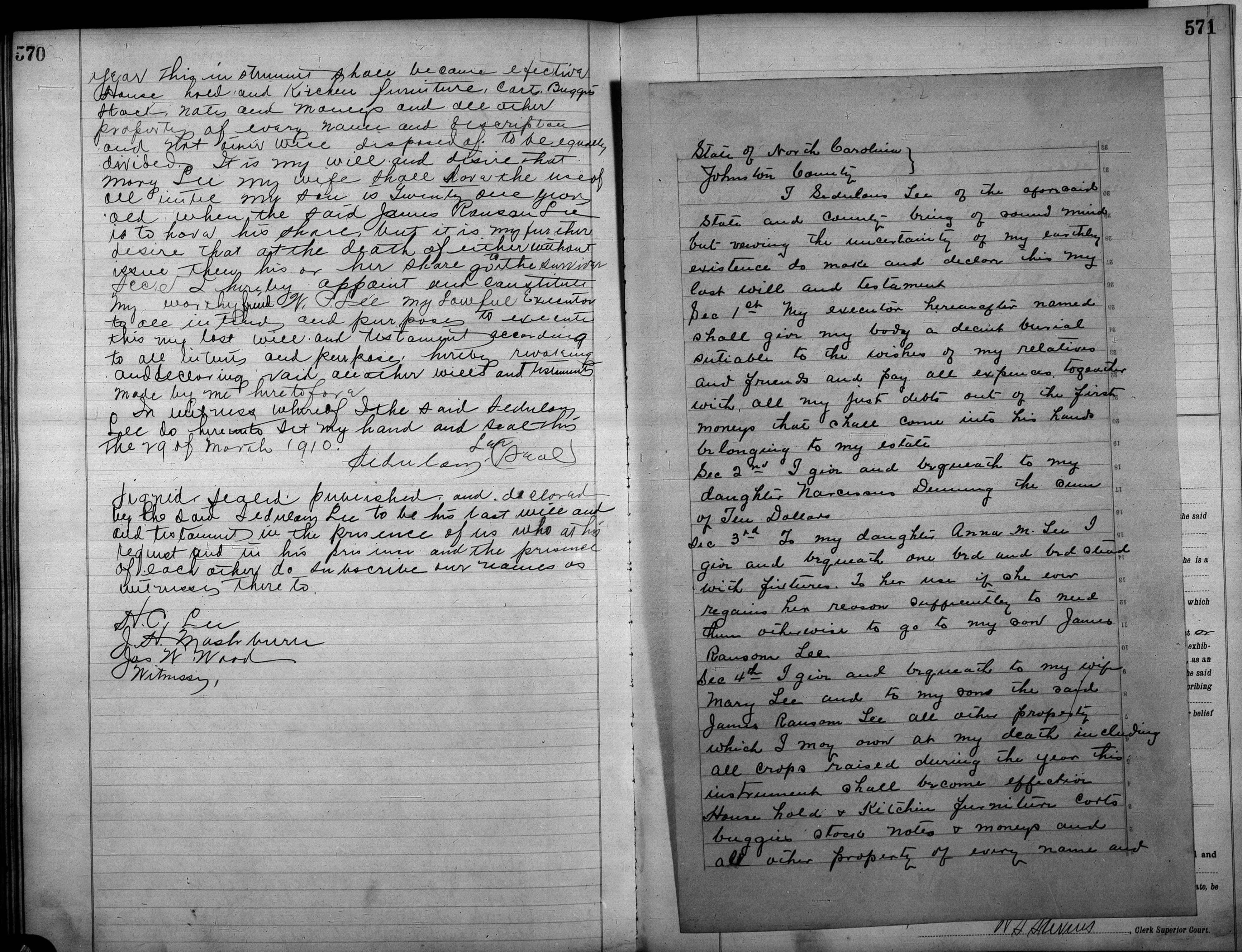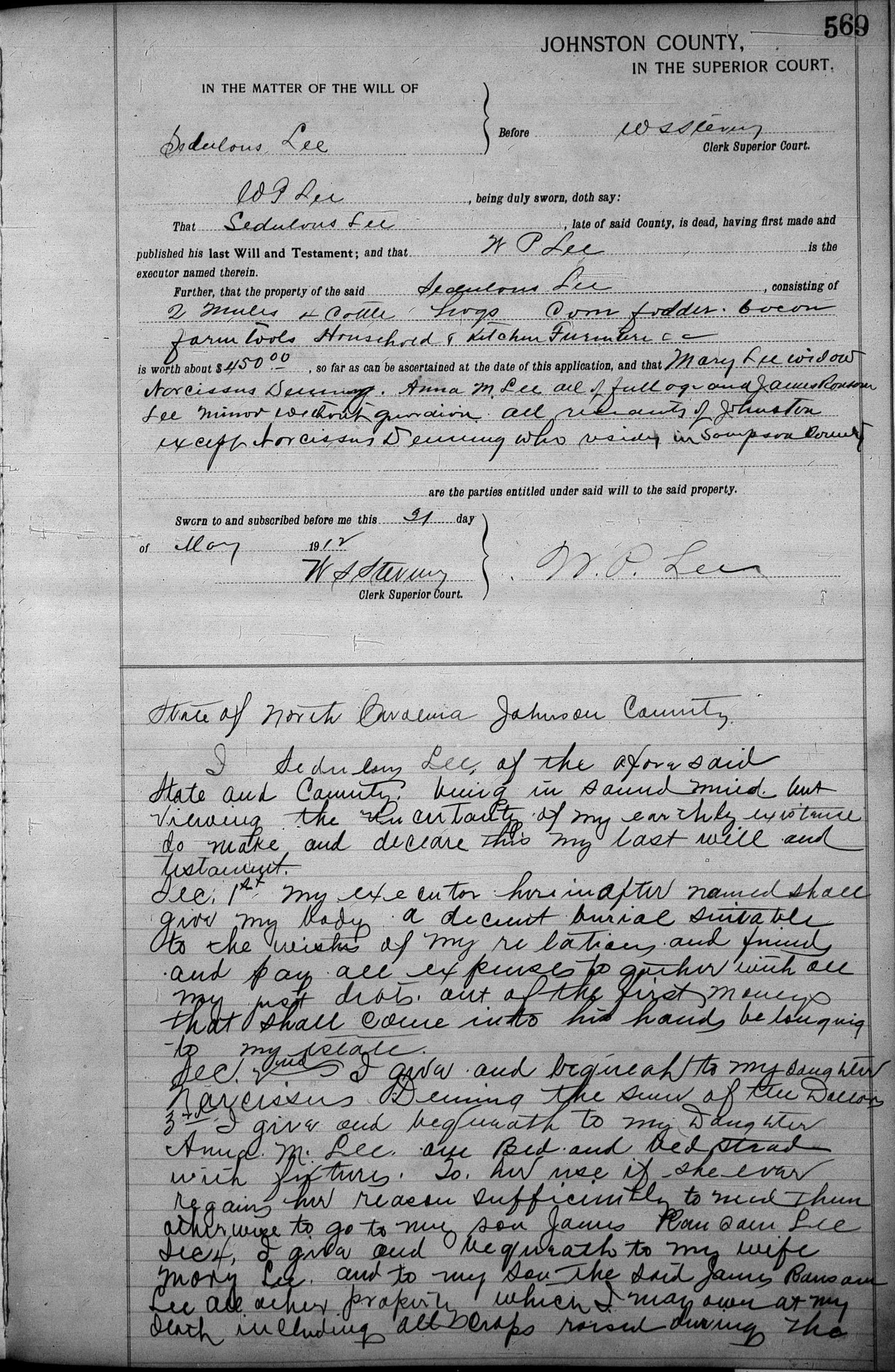 Further, that the property of the said Sedulous Lee, consisting of 2 mules, 4 cattle, hogs, corn, fodder, bacon, farm tools, household & kitchen furniture is worth about $450.00, so far as can be ascertained at the date of this application, and that Mary Lee widow, Narcissus Denning, Anna M. Lee all of full age and James Ransom Lee Minor without guardian all residents of Johnston except Narcissus Denning who resides in Sampson County are the parties entitled under said will to said property.