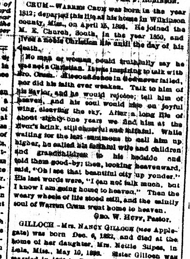WARREN CRUM was born in the year 1812; departed this life at his home in Wilkinson county, Miss., on April 15, 1893. He joined the M. E. Church, South, in the year 1850, and lived a noble Christian life until the day of his death.