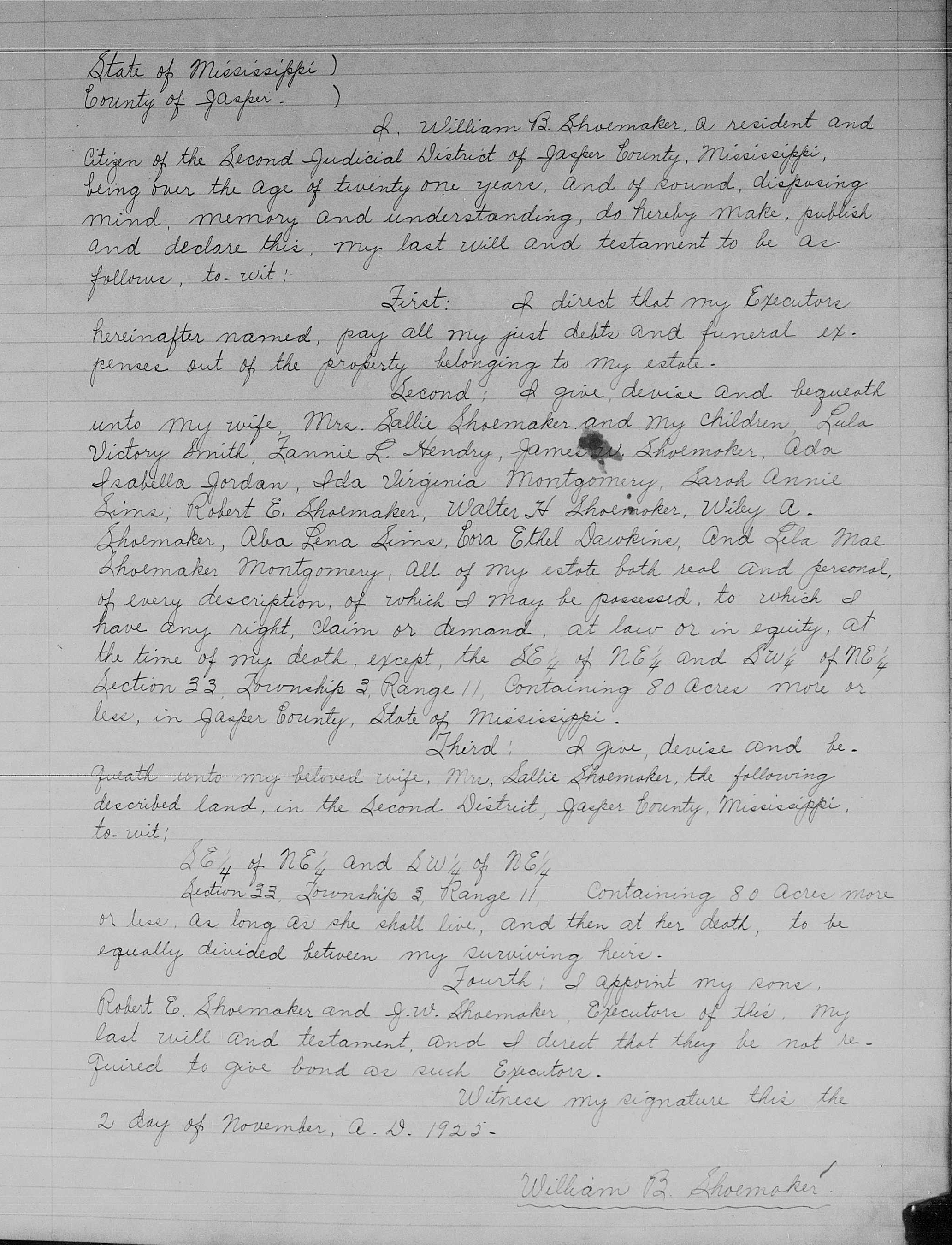 Second: I give, devise and bequeath unto my wife, Mrs. Sallie Shoemaker and my children, Lula Victory Smith, Fannie L. Hendry, James W. Shoemaker, Ada Isabella Jordan, Ida Virginia Montgomery, Sarah Annie Sims, Aba Lena Sims, Cora Ethel Dawkins, and Lela Mae Shoemaker Montgomery, all of my estate both real and personal, of every description, of which I may be possessed, to which I have any right, claim or demand, at law or in equity, at the time of my death, except, the SE 1/4 of NE 1/4 and SW 1/4 of NE 1/4 Section 33, Township 3, Range 11, containing 80 acres more or less, in Jasper County, State of Mississippi.