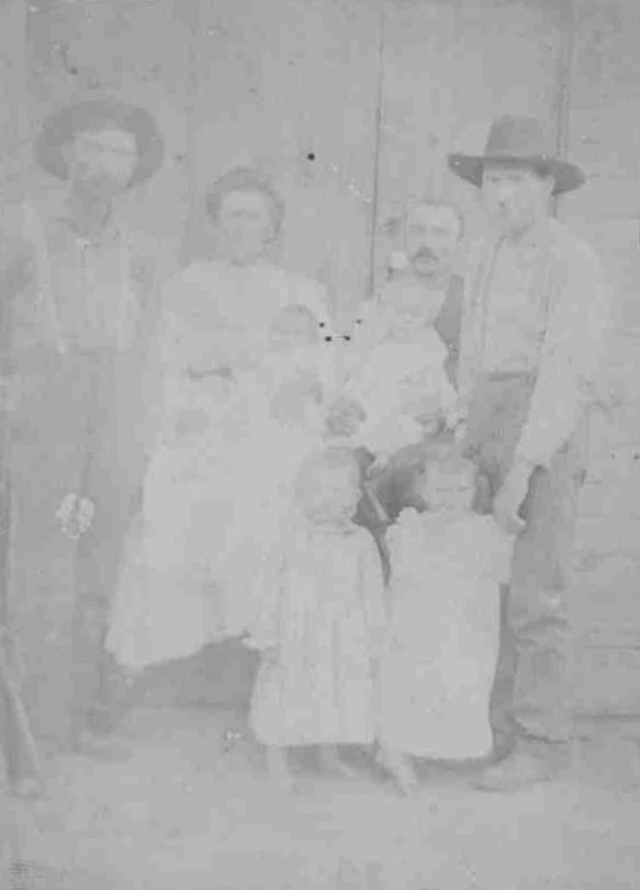 | Back Row (Left to Right): Lonnie Luther HARDY (Brother), Maggie Pearl THORN (first wife) holding daughter Rosa Mae HARDY, John Callender HARDY holding son Alfred Wesley HARDY, John Thomas HARDY I.