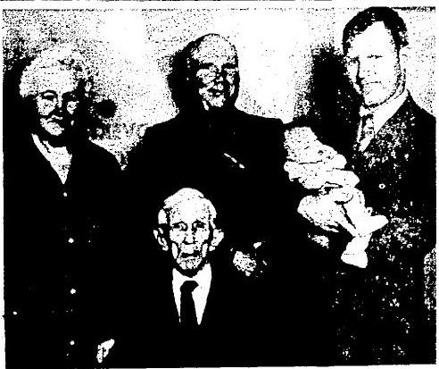FIVE GENERATIONS were present Sept. 24 [1972] in the Sam Pletcher home in La Feria during visits by out of Valley relatives. Seated in the picture is M. F. Arrington, a resident of Harlingen since 1923. Standing, left to right, are his daughter, Mrs. J. S. Pletcher of Lufkin, grandson, Sam Pletcher, great-grandson, Denny Pletcher of Laredo Air Force Base, and three weeks old Bradley Ryan Pletcher, a great-great-grandson.