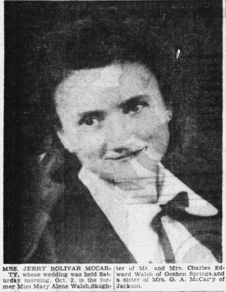 On Saturday morning, Oct. 2, at 10 o'clock, Miss Mary Alene Walsh, daughter of Mr. and Mrs. Charles Edward Walsh, Goshen Springs, became the bride of Jerry Bolivar McCarty, son of Mr. and Mrs. Jerry H. McCarty, Quitman.