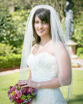 Escorted by her father, the bride wore a designer diamond white, Sottero-Midgley one-piece strapless, full A-line gown with corset closure. The embellished lace bodice featured a soft sweetheart neckline and an empire satin band. Embellished lace rained down the fine tulle lace skirt and encircled the hemline. She carried a hand-wrapped nosegay bouquet of hydrangeas, cool water roses, orchid, purple and lavender stock, green button poms and hypericum berries, lavender and purple alstromeria lilies, fuchsia waxflowers and stems wrapped with wild berry satin ribbon adorned with pearls.