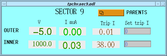 The brown PARENTS button allows you to return to the group voltage and current window for the rail which supplies this sector.